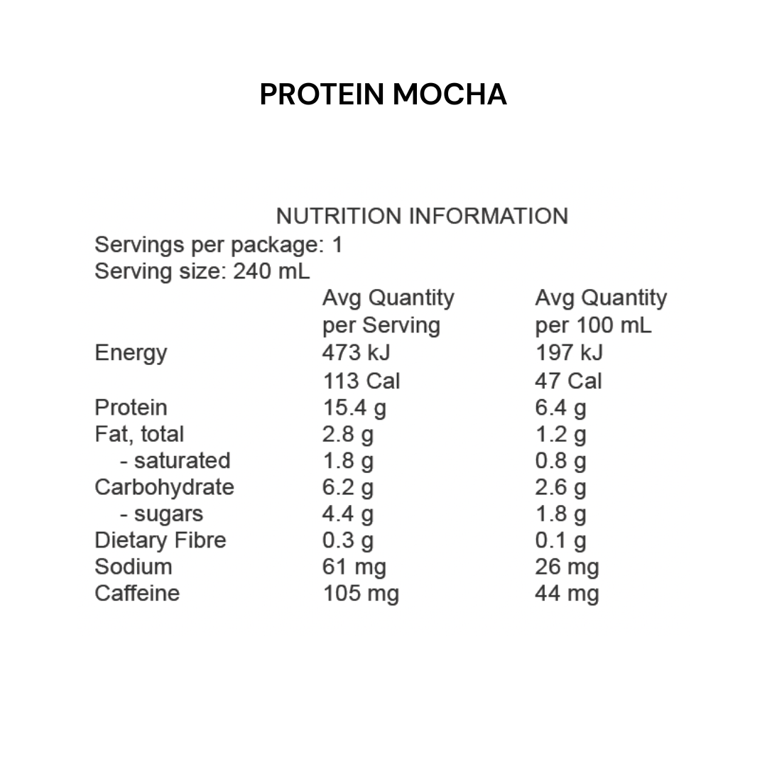 Ingredients: Water, Brewed Coffee (14%) [Water, Roasted Coffee Beans (20%)] Ultra filtered skim milk (6.3%), Whole milk powder (3.5%), Cocoa, Natural flavours, Salt, Natural sweetener (Monk Fruit)