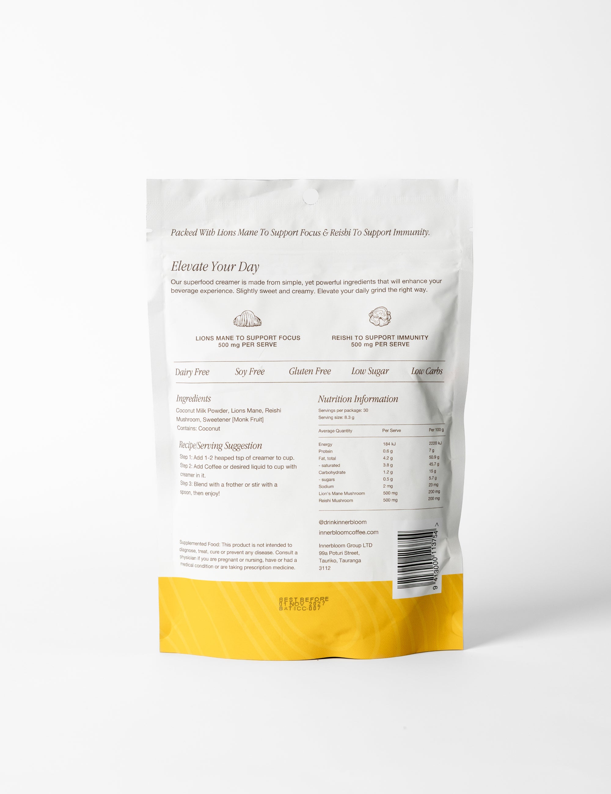 Ingredients: Organic Coconut Milk Powder, Lions Mane Extract 10:1, Reishi Extract 10:1 and Monk Fruit